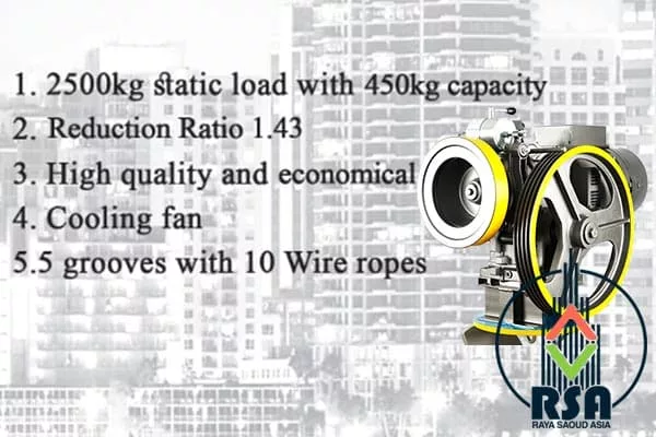 این موتور گیربکس مناسب ساختمان های 6 ایستگاه و با ظرفیت 450 کیلوگرم طراحی شده است.و فلکه آن به صورت 4 شیار بوده و مطابق با سیم بکسل نمره 10 به بازار عرضه شده است.