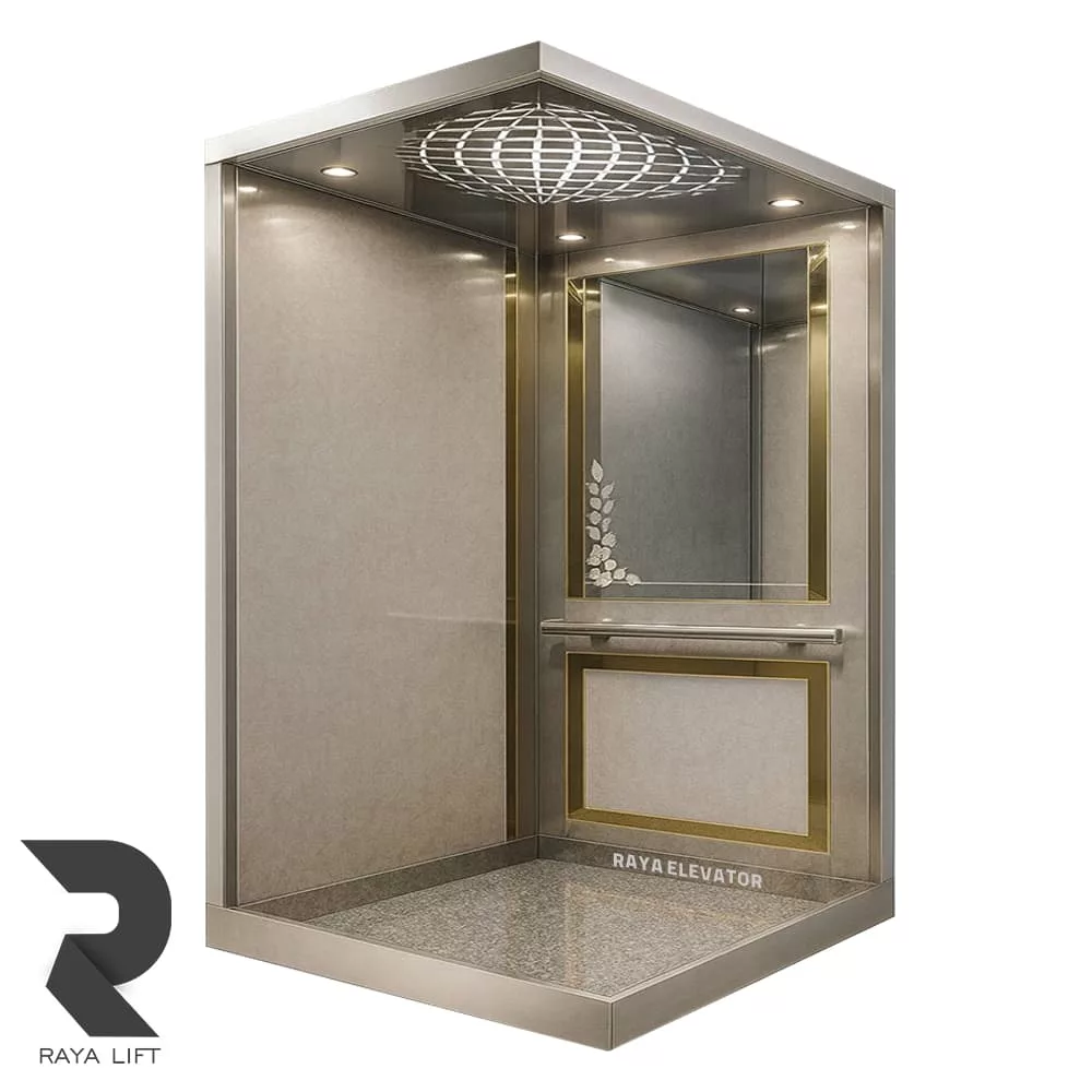 کف و سقف با ورق 2 و 3 میلی متر و بدنه کابین با ورق گالوانیزه 1.5 میلی متر گالوانیزه ساخته می شود.برای ساخت کف کابین ، از ناودانی یک لایه ورق قوی فولادی 2 میلی متر و یک لایه MDF استفاده می شود.یکی از کابین های لوکس واحد کابین مجموعه رایا ، کابین آسانسور استیل کد3502 است.